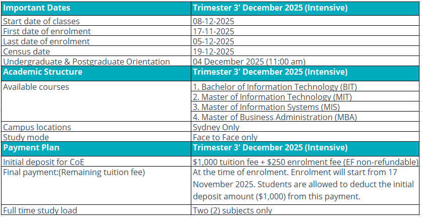1. Students enrolled in Trimester 3' intensive intake (08 December 2025) will be required to re-enrol in March 2026 intake for at least 2 subjects.