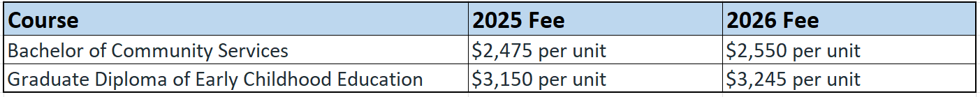 AE confirms that the Bachelor of Community Services (BCS) and Graduate Diploma of Early Childhood Education course fee will increase and will be effective for all applications submitted on or after 17th November 2025.