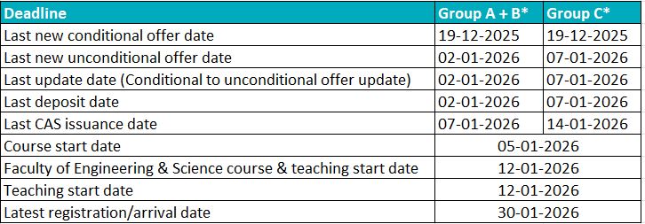 Please see the key deadlines and essential information related to CAS issuance and admission processes for the January 2026 intake by visiting the CAS & Admission section on Discover Greenwich.