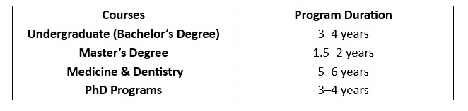 These universities offer Bachelor’s, Master’s, and PhD programs in English.