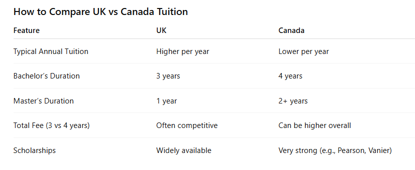 The UK generally has higher annual tuition fees for international students, especially at well-ranked universities.