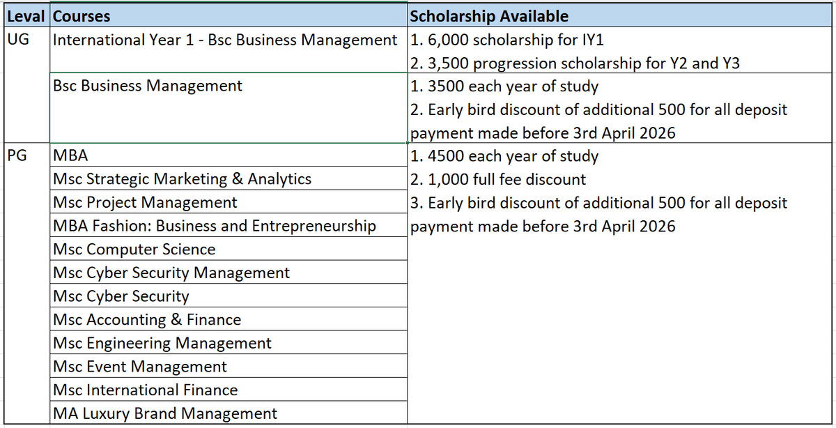 - Total Potential Saving: When combined with the £3,500 International Scholarship, an eligible student paying in full and early could receive a total deduction of £4,500.
